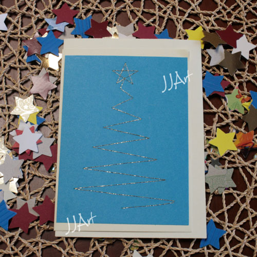 Kartka świąteczna przedstawiająca choinkę w wersji minimalistycznej, wykonana haftem matematycznym na niebieskim podkładzie złotą nicią, baza ecru.