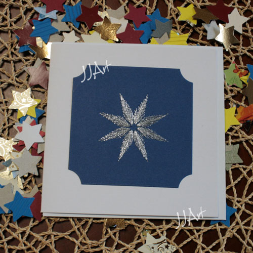 Kartka wykonana techniką haftu matematycznego na granatowym tle srebrną nicią