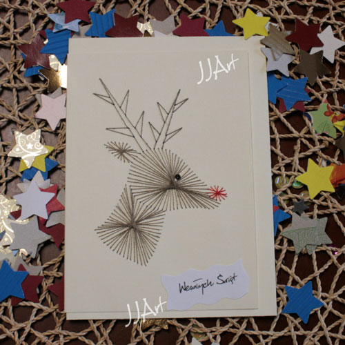 Kartka świąteczna przedstawiająca renifera z czerwonym noskiem, wykonana haftem matematycznym na bazie ecru. Wykonanie Małgosia 10 lat.